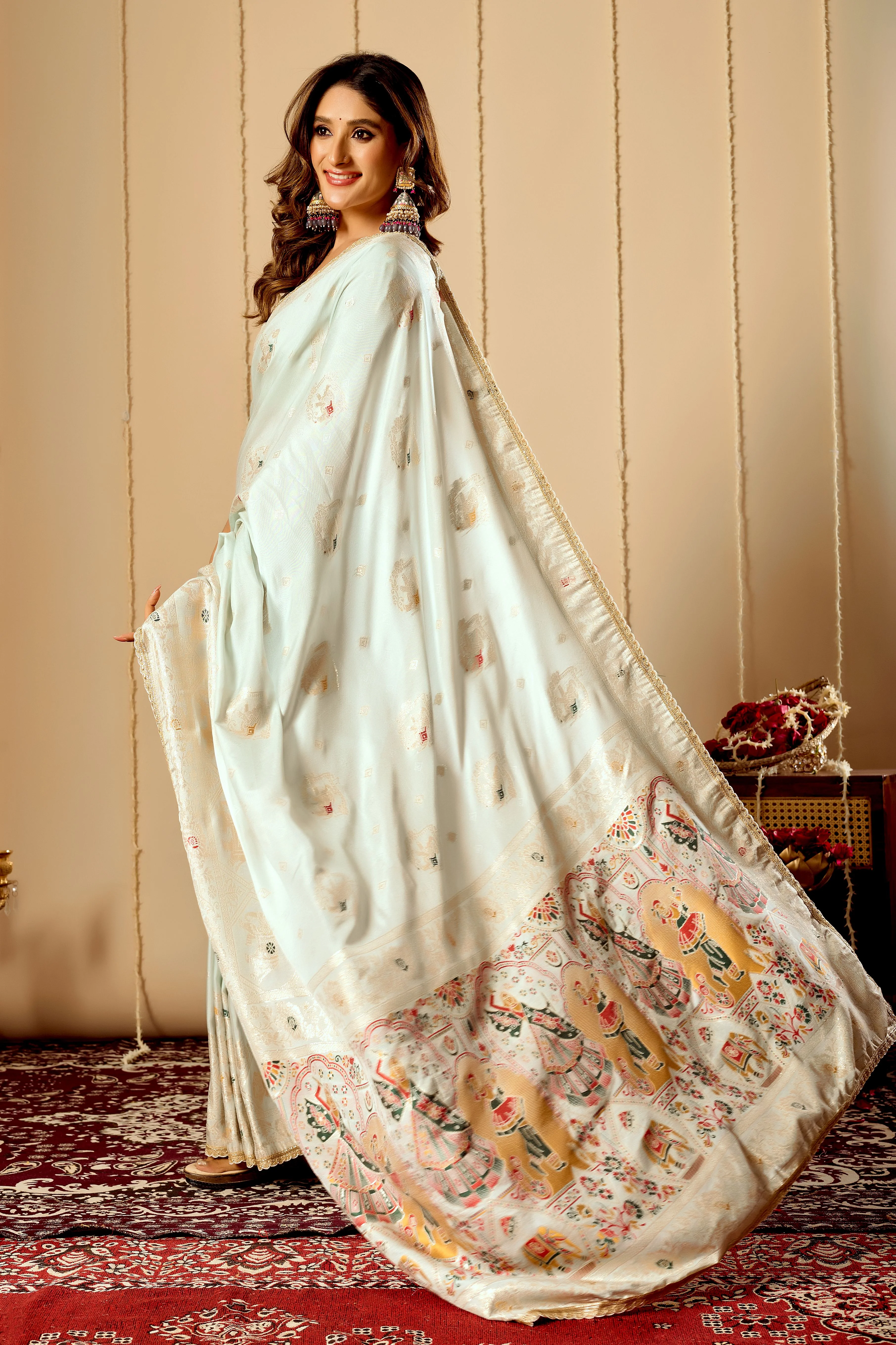 Elegant Mint Ivory satin Silk Saree with Subtle Gold Zari Weaving and Traditional Artistic Pallu